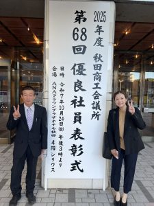 先日秋田キャッスルホテルで行われた優良社員表彰式に弊社社員泉谷と佐々木が出席致しました♪